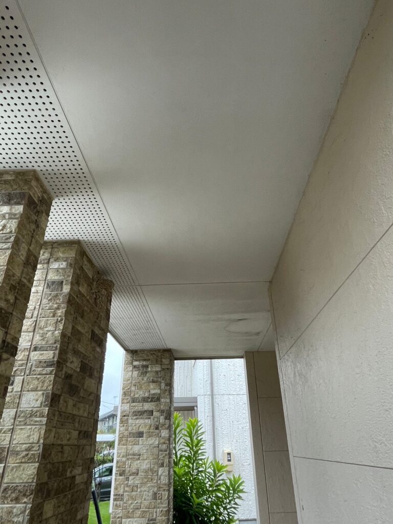 軒天は、ケイカル板でできています。経年劣化によるは色褪せ、剥がれが目立ちました。