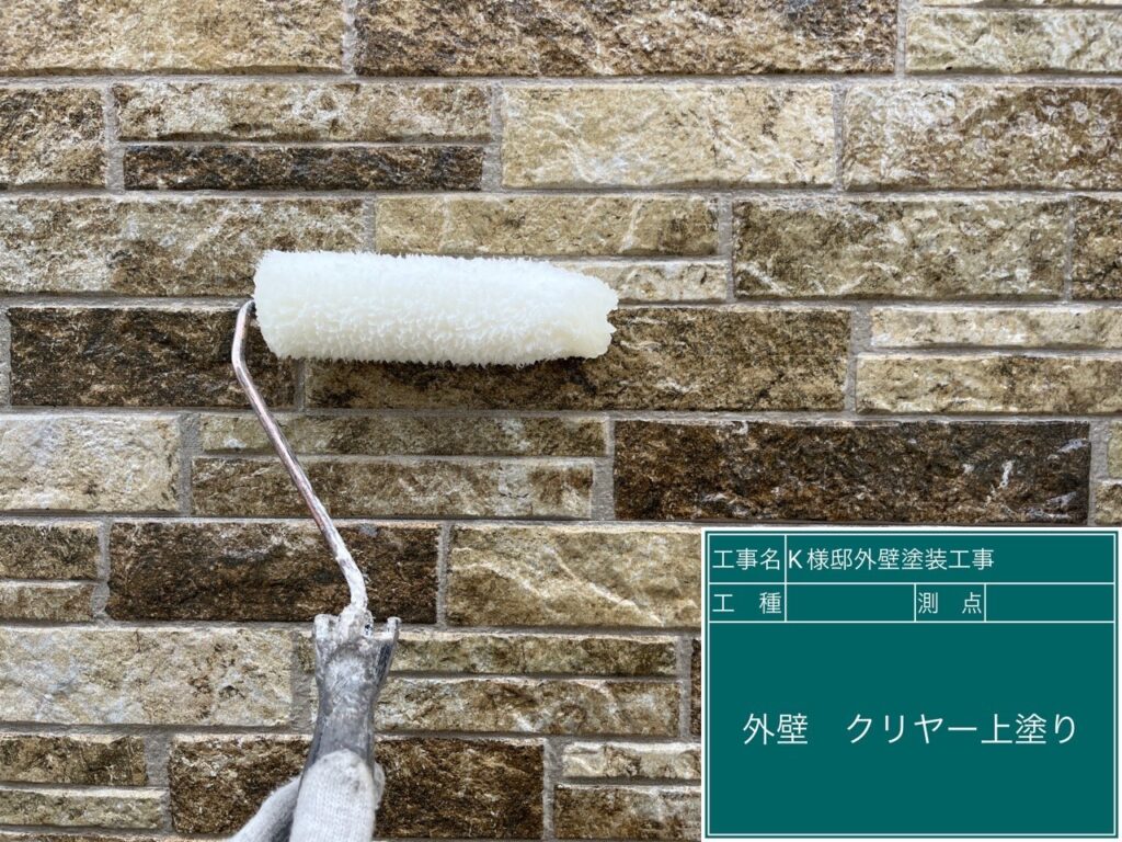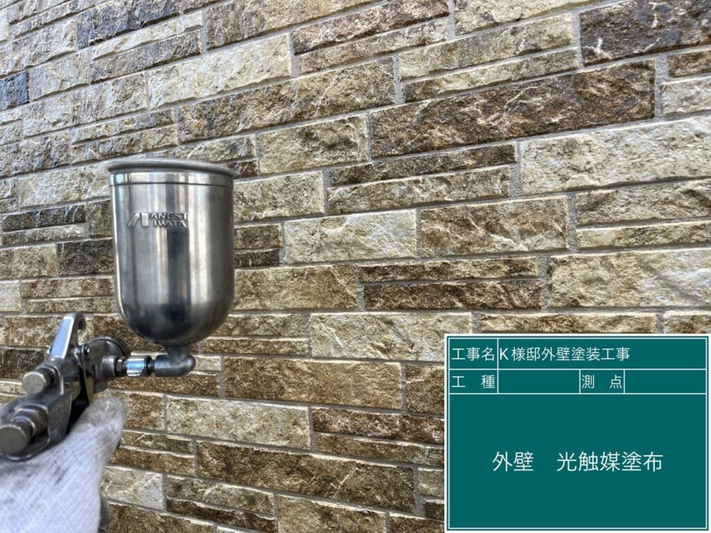 壁に仕上げ材の光触媒プロテクトコーティング(クリスタルシーズンtg)を塗布します。