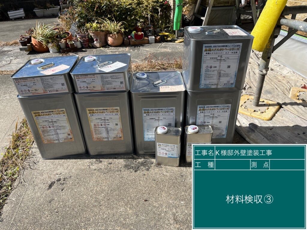 | 使用商材・建材 | 外壁 : 無機エクスカリバーAZ-W(2液型水性/バーテックス無機塗料/CPJ・~クリスタルペイントジャパン~) 目地&開口部 : オートンイクシード(超高耐久・高耐候シーリング材/オート化学工業) 付帯 : 4Fイージスガード(2液型弱溶剤/無機配合型4フッ化フッ素塗料/CPJ) 仕上げ : クリスタルシーズンtg(可視光応答型ハイブリッド光触媒プロテクトコーティング) |